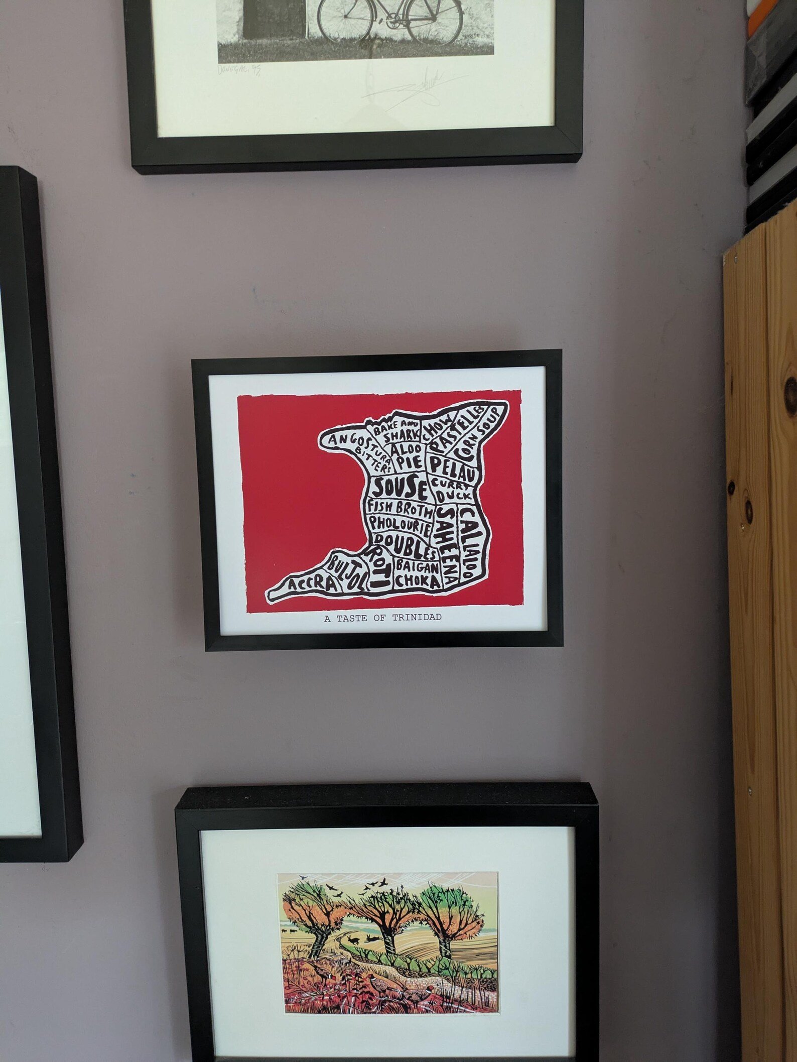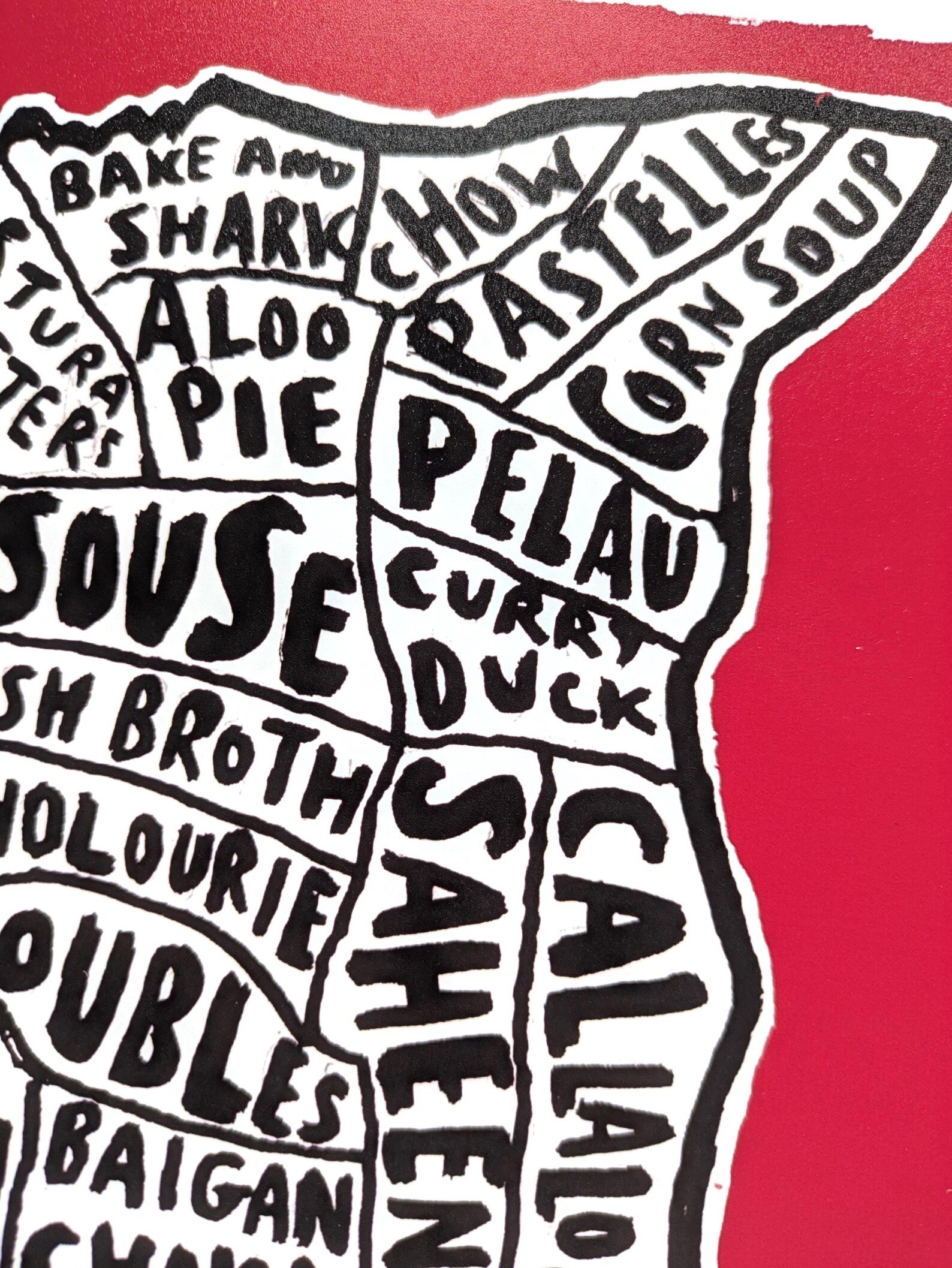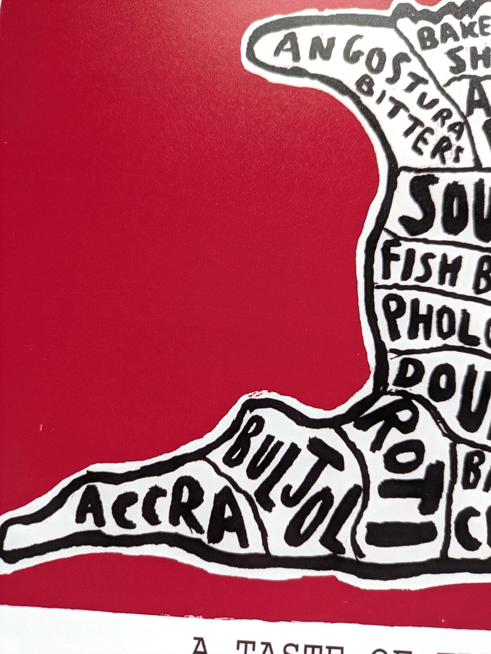 A colourful map exploring some of the foods and drinks associated with the Caribbean island of Trinidad.